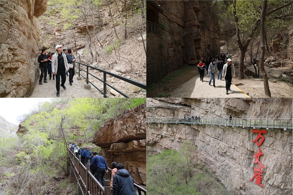 參觀活動結束后,大家開始游覽京東大峽谷,沿著崎嶇的山路,欣賞大峽谷鬼斧神工的自然景觀。漫步于美麗的龍門湖,看群峰倒映水中;依崖而建的人工棧道,猶如攀巖在懸崖峭壁上,大家身臨其境,感受當年軍民抗日的艱難險境;天然形成的五龍?zhí)丢毦犹厣械纳畈豢蓽y,有的靜若處子,有的湍瀉奔流,為大峽谷增添了靈氣。大家在曲折陡峭的山路中穿行,互相鼓勵,相互扶持,順利通過。一路游覽,一路暢談,一路體驗,大家感受到了自然風光的美麗和今日生活的美好。